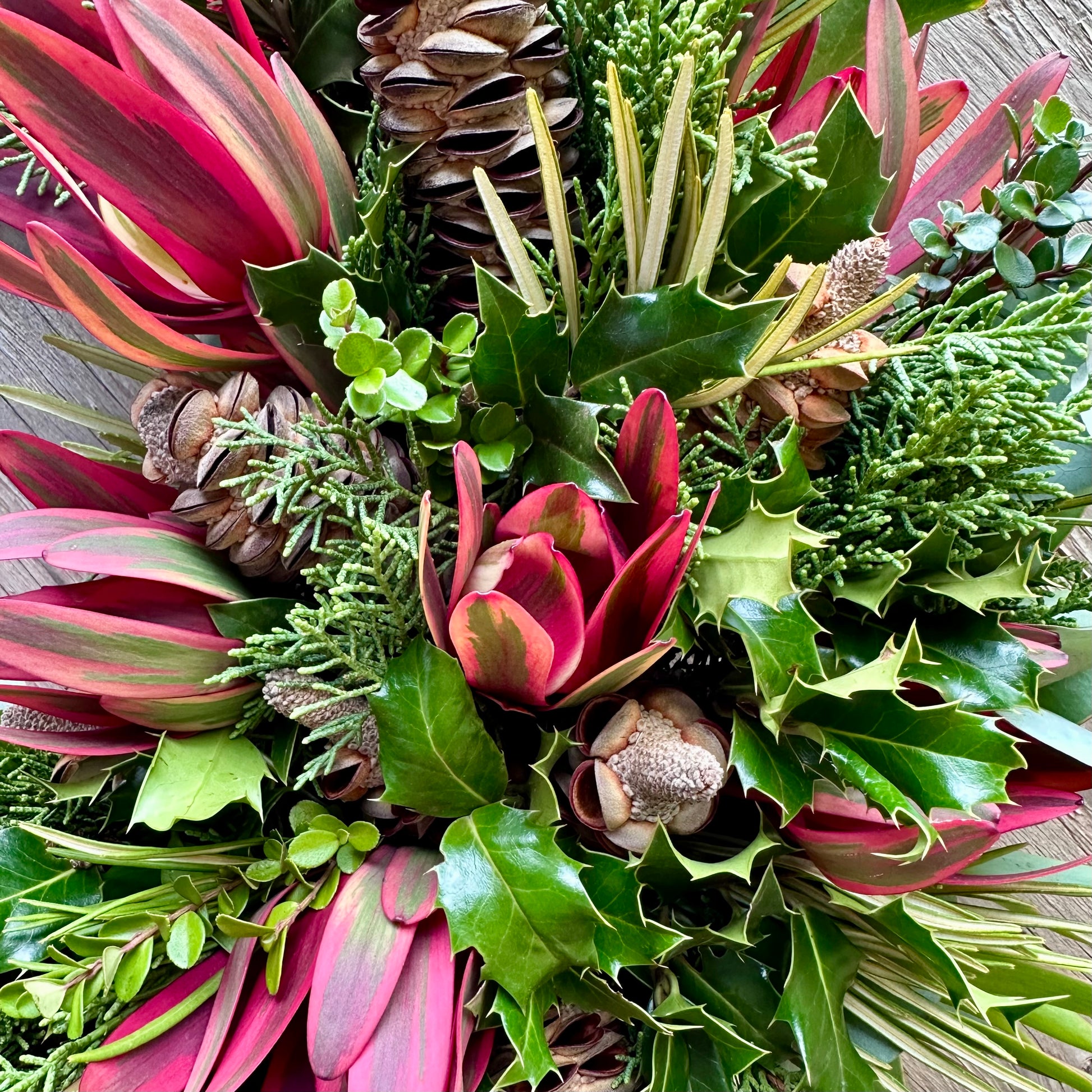 Building on a 14″ red burlap wrapped straw base, our limited quantity, Anuhea Holly Jolly Christmas Wreath reaches 22-24″ diameter at its largest point. This gorgeous wreath will bring the joy of classic holiday colors from our farm on Maui right to your door. Each wreath is one-of-a-kind, but will feature varieties of safari leucadendron, integrafolia cones, and mixed foliage from our farm. The scent of the juniper and eucalyptus will be incredible! Contains Holly leaves; handle and hang with care. All will be arranged and assembled with much Aloha. Sent and made fresh and dries beautifully for a gift that lasts a lifetime.