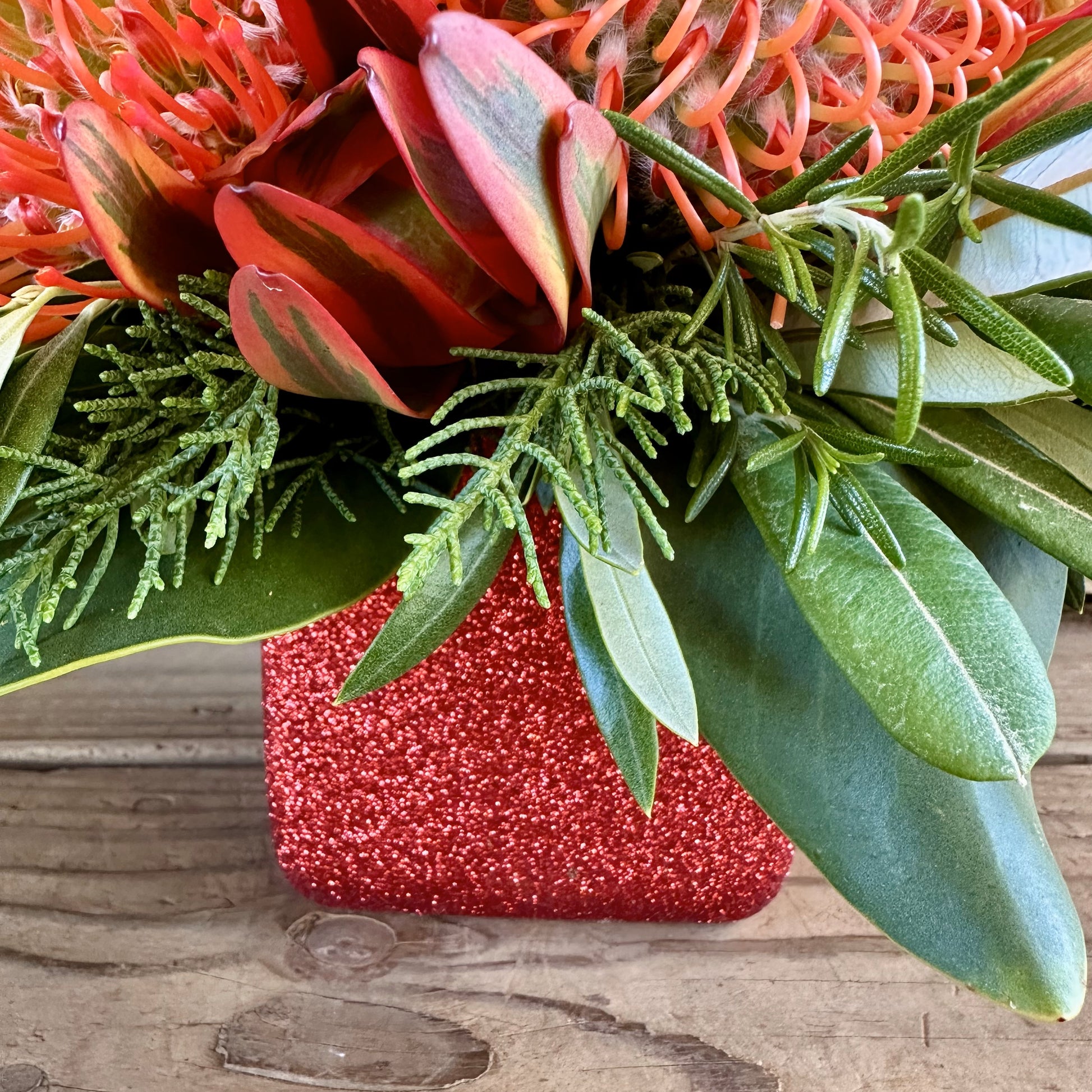 We're adding some glitz to the offerings this Season! Arranged in a glittering, red, ceramic vase, your "Holiday Sparkle" arrangement will feature a stunning King Protea* surrounded by vibrant red pincushion protea and be accented with traditional holiday greenery like fresh juniper from our farm along with golden twirls to add that extra holiday feel.